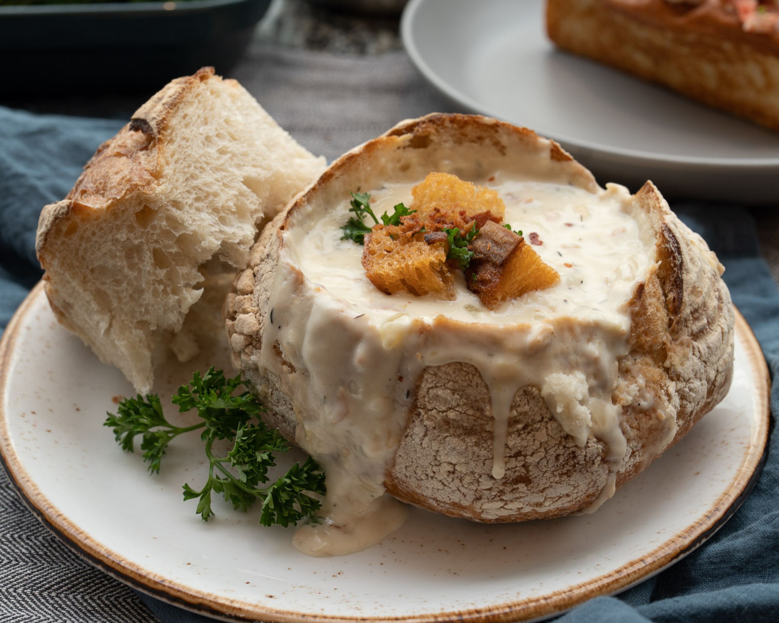 We source our bread bowls from Grand Central Bakery, a Pacific Northwest institution that has been making artisan sourdough the right way for decades. Their sourdough has a crackly, golden crust and a pillowy open interior built from a natural starter. It is the right bread for the job, and we wouldn't use anything else.