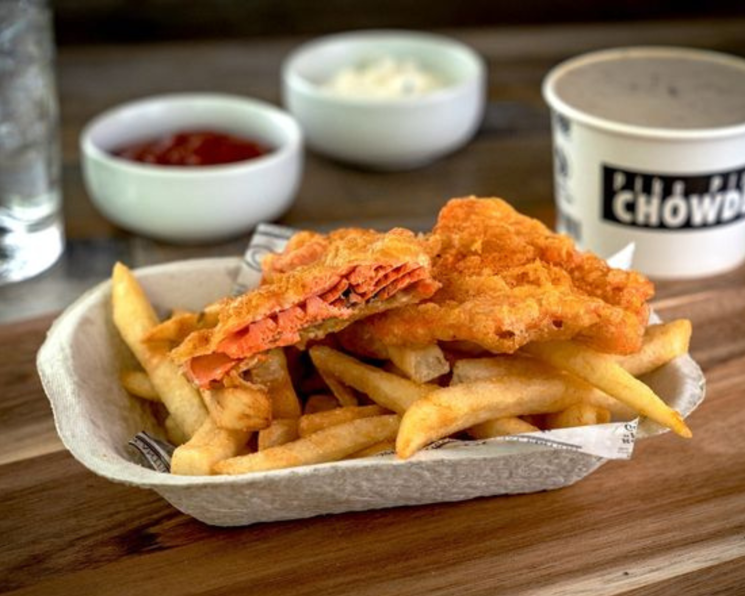 Most fish and chips spots in Seattle serve one fish. At Pike Place Chowder's Pacific Place location we serve three, each one lightly battered, Pacific Northwest sourced, and served with house-made tartar and cocktail sauces, a lemon wedge, and fries. Alaskan Cod, Wild Sockeye Salmon, and seasonal Alaskan Halibut. No frozen fish, no heavy batter, no shortcuts.