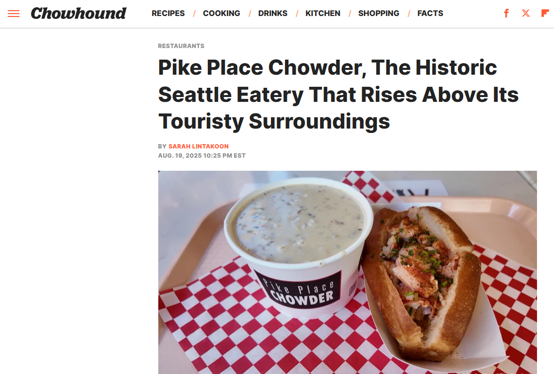 Featured on Chowhound: A Seattle Must-Try Read the full article here Pike Place ChowderAugust 27, 2025 Facebook0 Twitter Reddit Tumblr Pinterest0 0 Likes