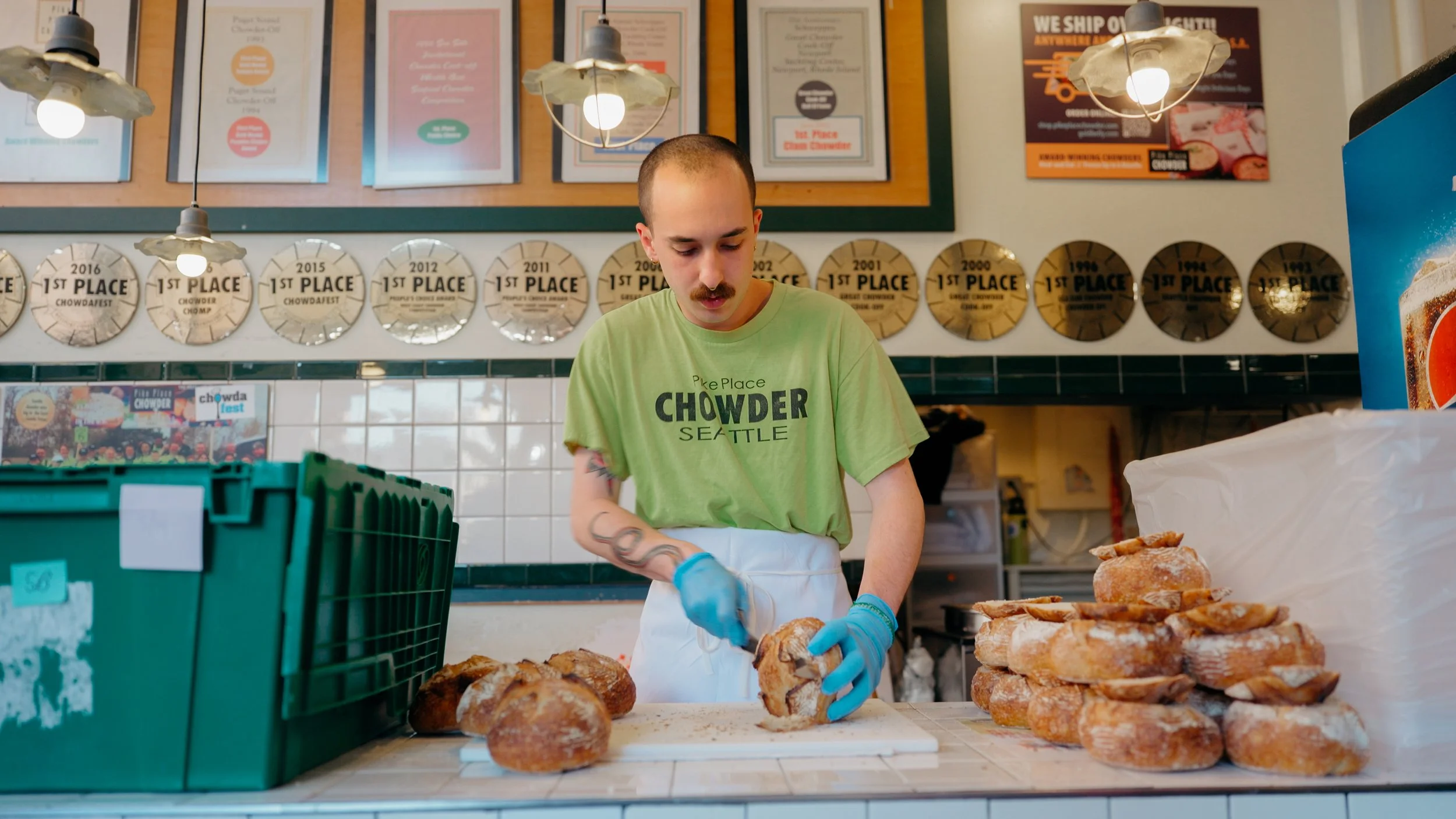 Pike Place Chowder is committed to using locally sourced ingredients, including fresh produce selections that come directly from Pike Place Market, while our creamy chowders feature heavy cream from local dairies in Kent, Washington. Our fresh sourdough bread comes from Grand Central Bakery, a local Seattle bakery, and over 90% of our dining materials are fully compostable. Made fresh daily in small batches, our chowders minimize food waste while delivering bold, award-winning flavors.
